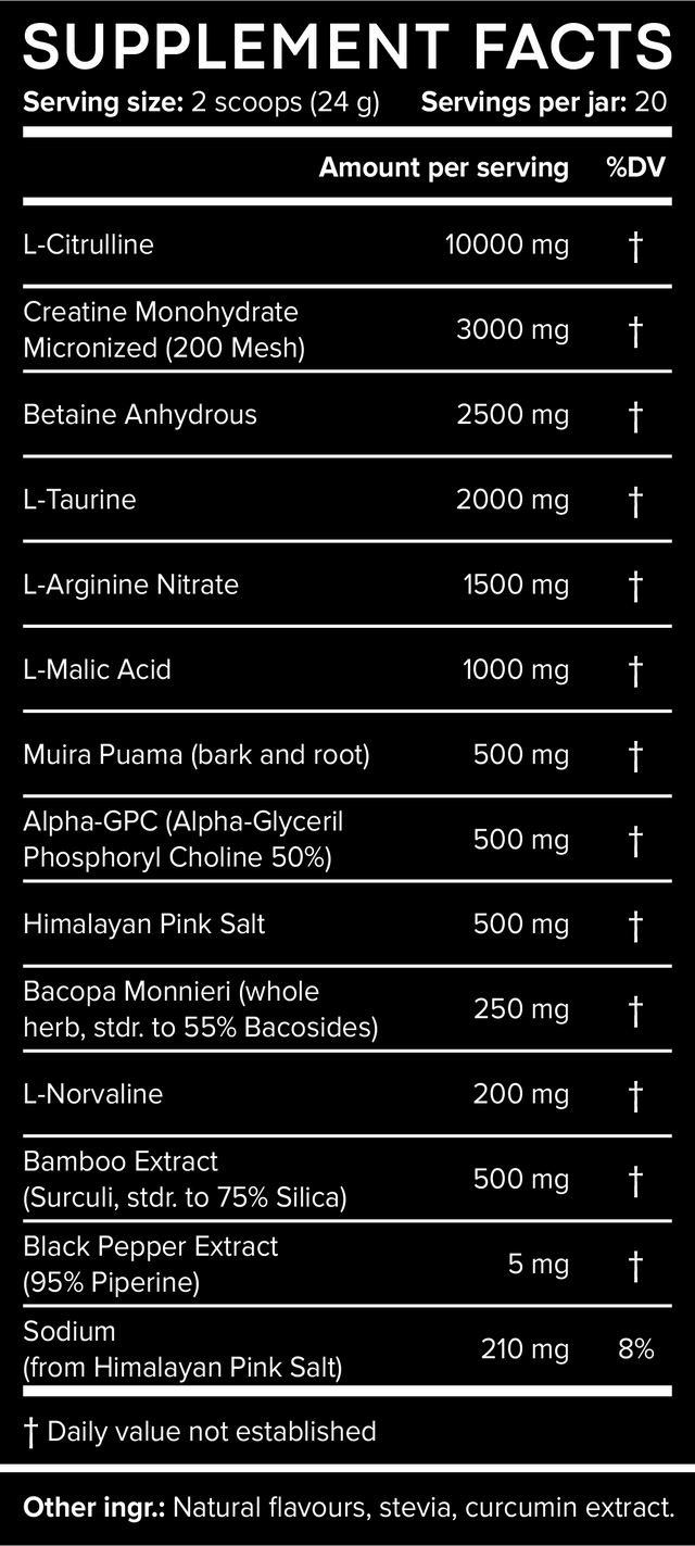 The clinically doses of l-citrulline, l-arginine nitrate, l-norvaline and sodium from Himalayan pink salt make ENHANCED a unique product, specifically formulated to maximise cellular hydration, leading to extended stamina, power output and insane pumps.