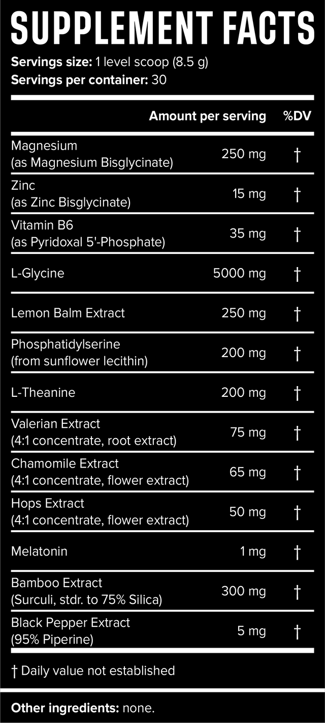 ZMA is a combination of zinc, magnesium and vitamin B6, that has been widely studied and it has been shown by clinical research to be an effective supplement for enhancing muscle recovery, boosting muscle size and strength, and even aiding fat loss. It does that through several mechanisms, but mostly allowing you to maximize the benefits of a good night sleep. We chose to use the bisglycinate form of magnesium and zinc, as the glycine molecule attach to them has a calming effect on the brain, and pyridoxal 5'-phosphate as vitamin B6, since it gets absorbed much better by the body.