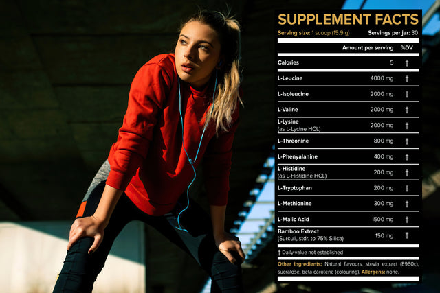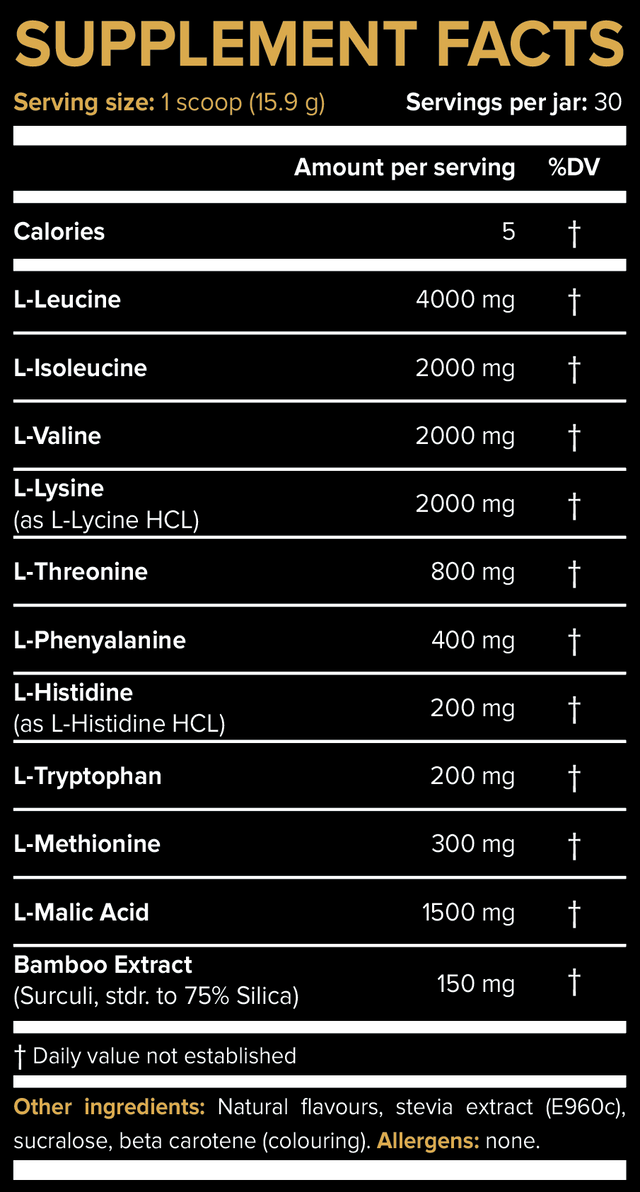 Of the 12 grams per serving, 8 grams are branched-chain amino acids (leucine, isoleucine, and valine) provided in the scientifically recommended 2:1:1 ratio. Leucine plays the primary role in stimulating muscle protein synthesis, especially post-exercise. Valine is particularly valuable pre-workout, as it helps blunt fatigue through central mechanisms in the brain, while isoleucine supports muscle tissue repair and may contribute to improved energy availability.