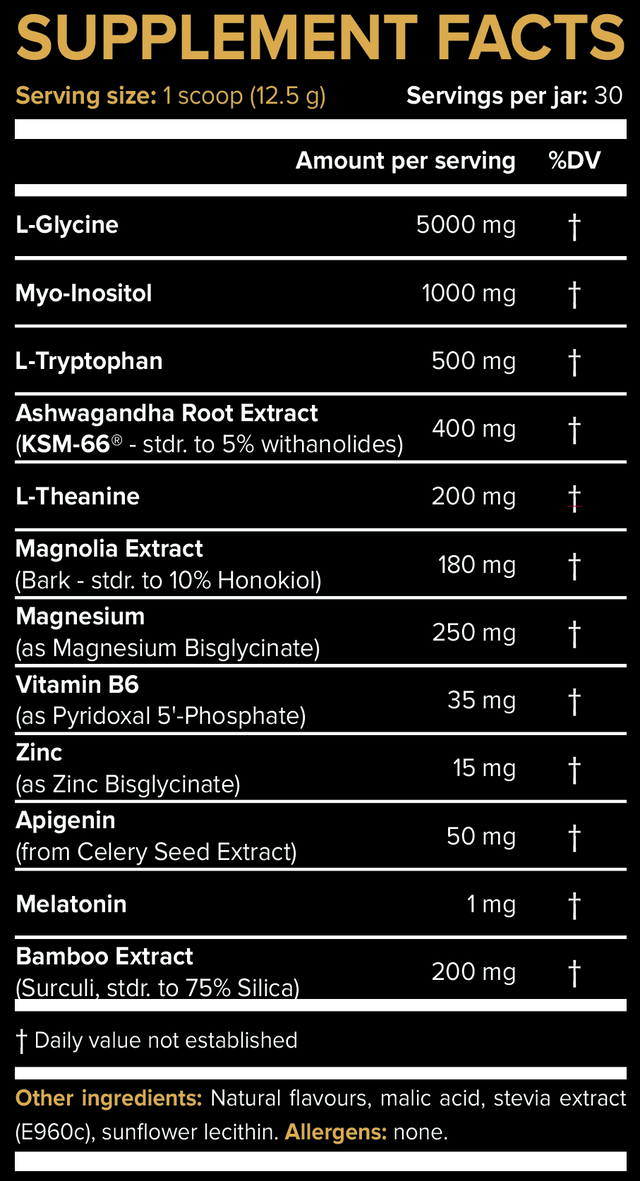 Myo-inositol is a naturally occurring nutrient that plays a quiet but powerful role in the brain’s nightly housekeeping. It supports healthy neurotransmitter signaling, helps regulate the stress response, and promotes a smoother transition into restorative sleep. Clinical research shows that myo-inositol can improve sleep quality, reduce nighttime restlessness, and enhance overall calmness by supporting serotonin pathways and balancing stress hormones. We included a full, evidence-based dose of pure myo-inositol because it works in harmony with the rest of the formula, amplifying relaxation at the source and helping your mind drift into a deeper, more satisfying sleep cycle.