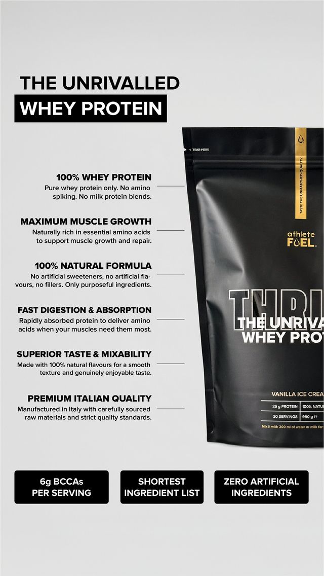 THRIVE was developed with the same level of precision applied to its performance ingredients. Using high-quality Italian whey protein and natural flavour systems, every serving delivers a smooth, rich and authentic taste without artificial aftertaste or excessive sweetness. The result is a protein you will want to drink every day, making consistency effortless and supporting long-term muscle growth and recovery.