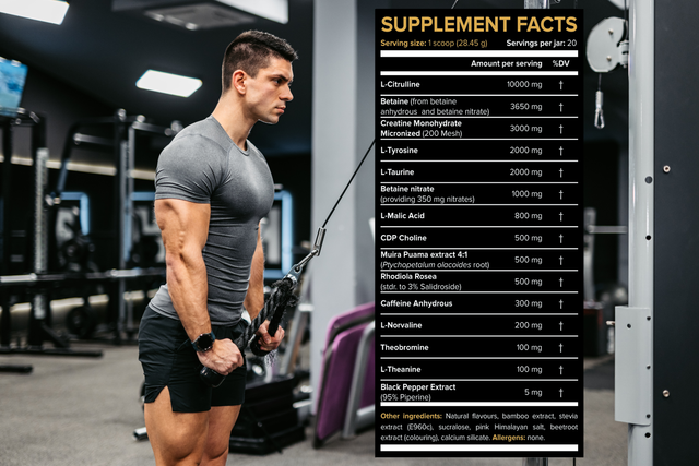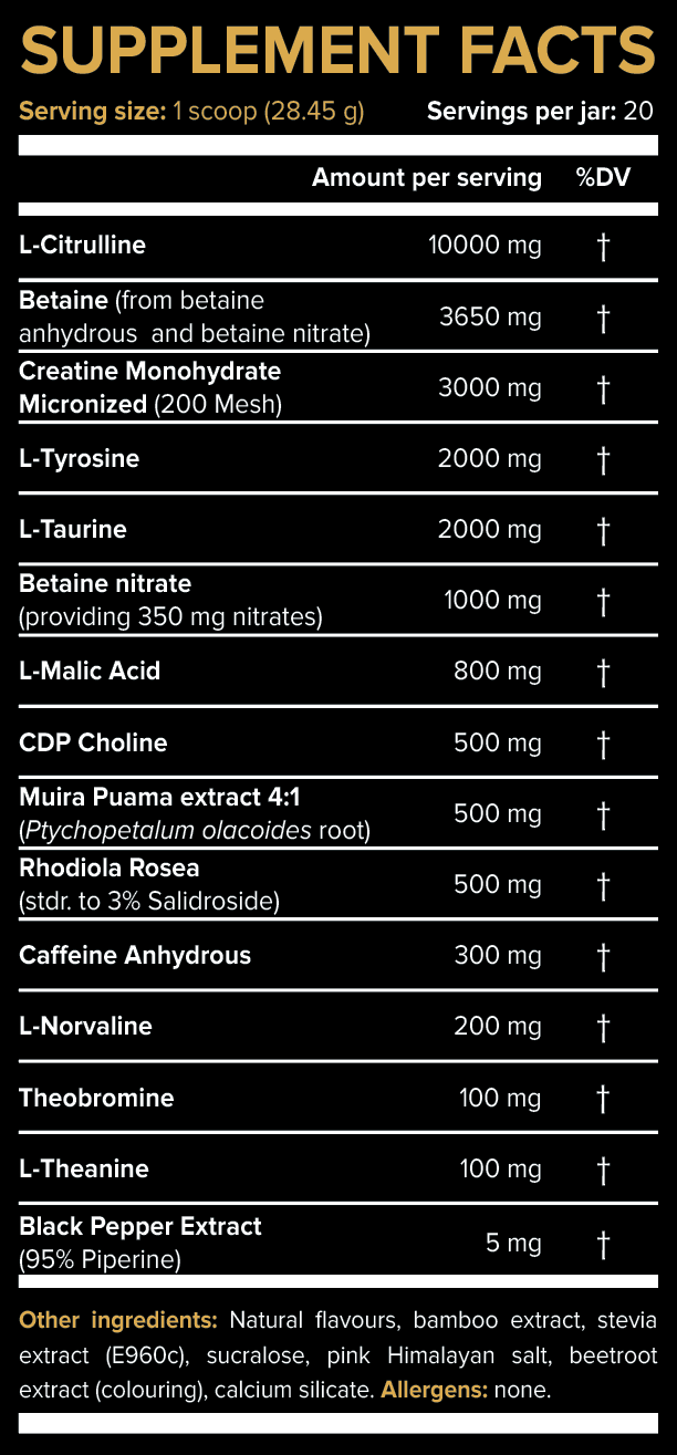 We chose to use betaine nitrate as one of the most effective nitric oxide (NO) boosters available. Nitrates are powerful vasodilators that increase NO levels in the body through a pathway independent of the arginine-citrulline route, which means they bypass common metabolic bottlenecks and deliver reliable results. Once ingested, nitrates are converted into nitrites and then into nitric oxide, enhancing blood flow, oxygen delivery, and muscle pumps. This mechanism has been shown in multiple studies to significantly improve exercise performance and endurance. In particular this study has demonstrated that nitrate rich foods are significant precursor to NO in a dose-dependent manner in humans [R].